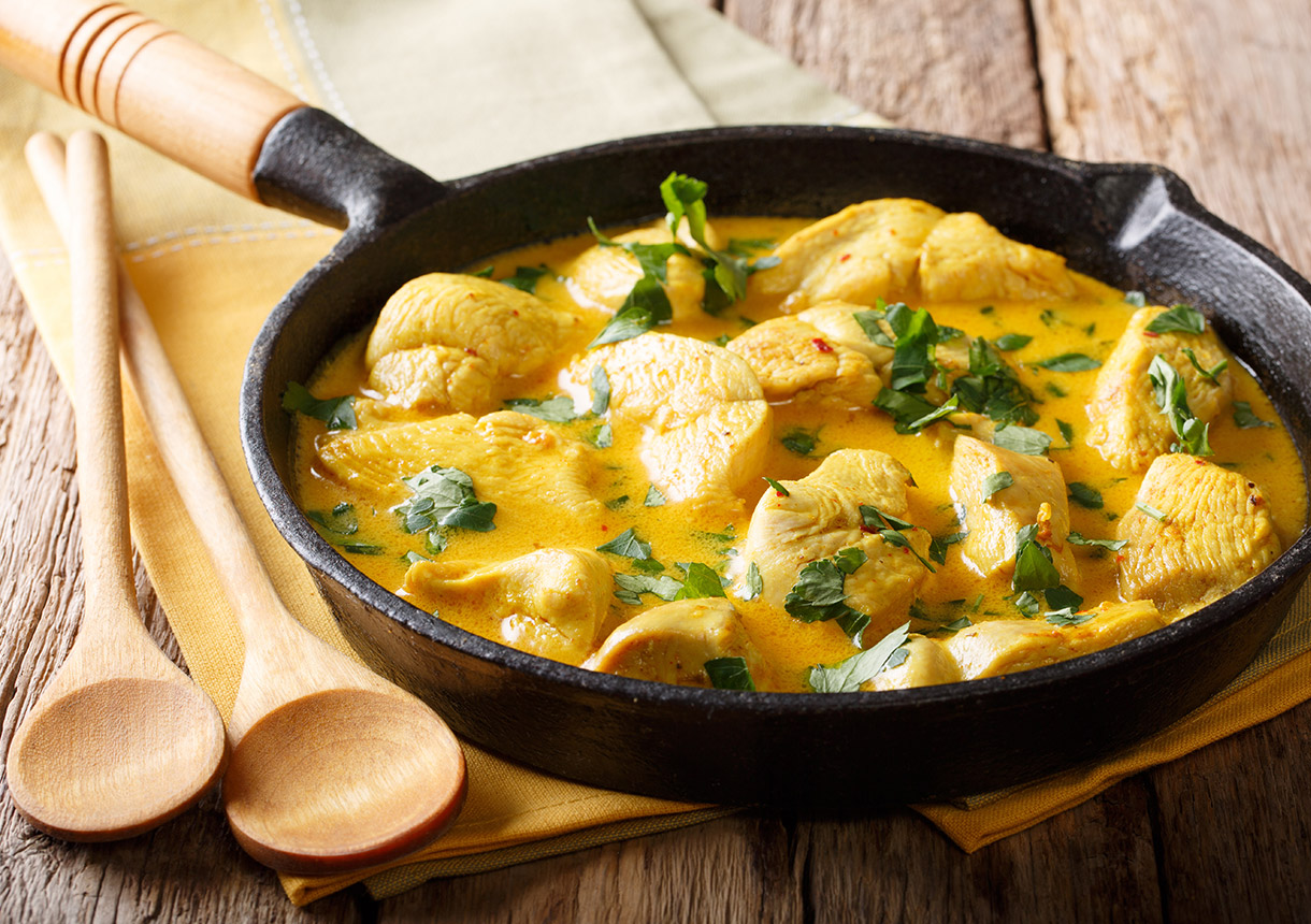 - Mit Hühnerbrühe sowie Curry und Salz/Pfeffer abschmecken, evtl. etwas naturtrüben Apfelessig oder Zitronensaft zugeben, Crème Fraîche unterrühren, kurz ziehen lassen.